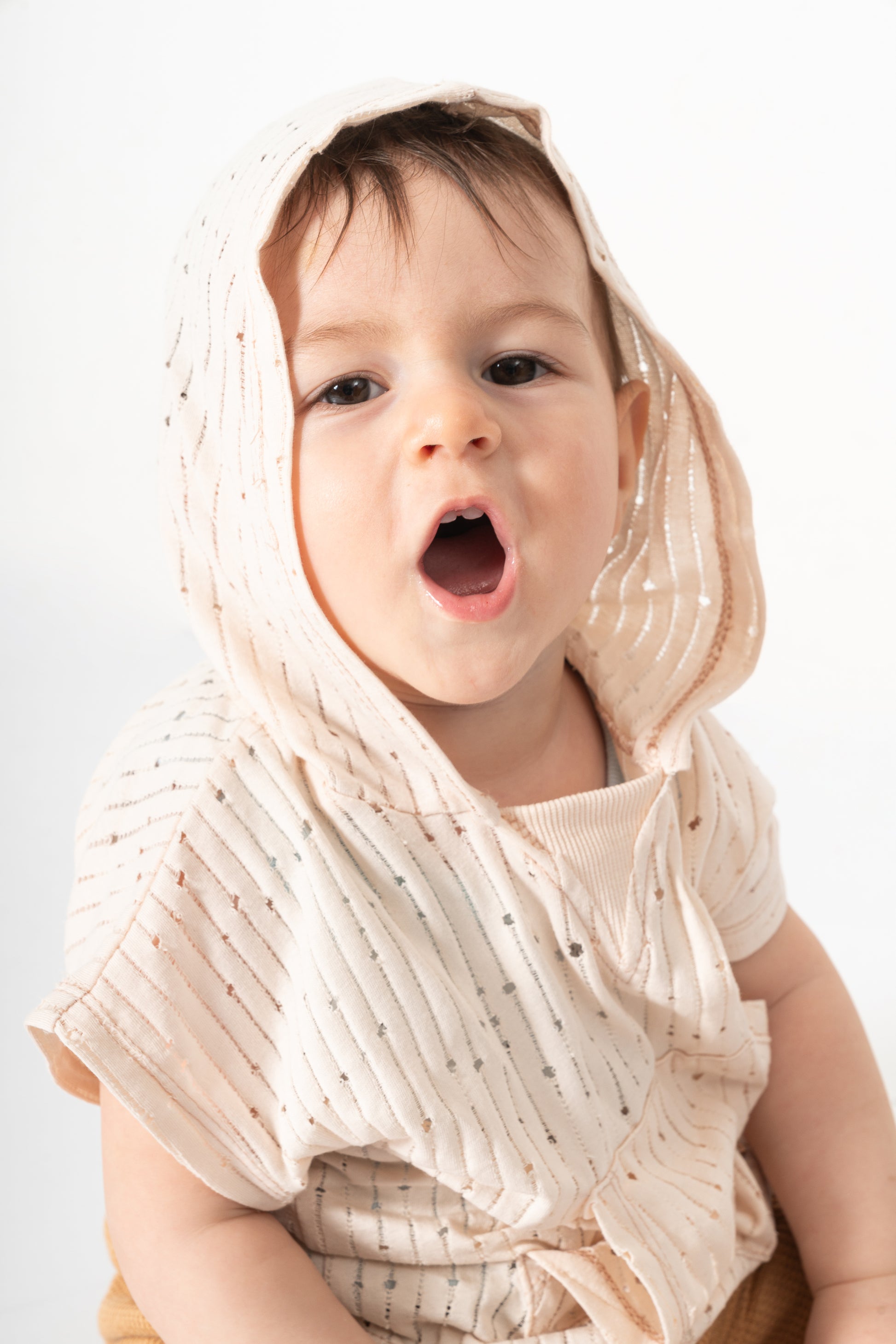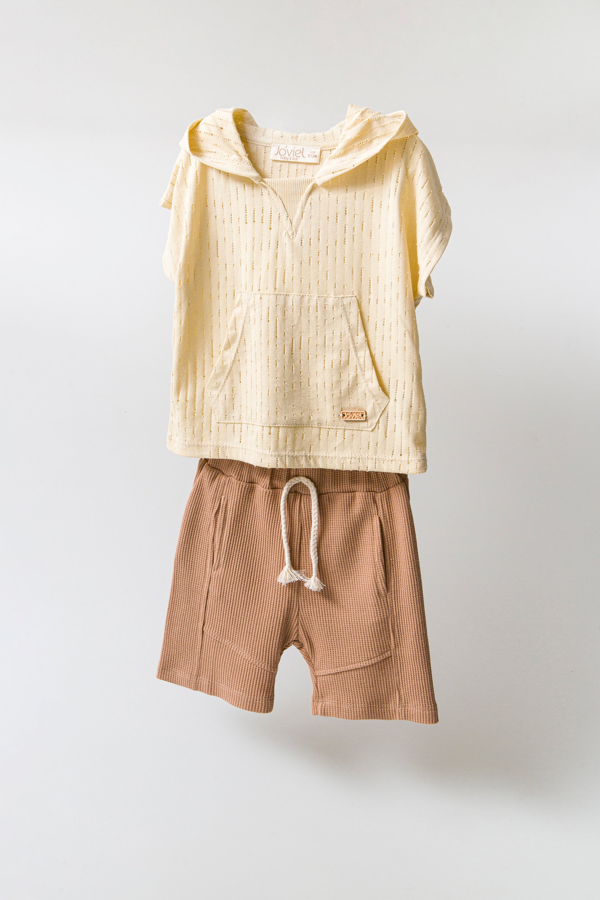 Hergestellt aus 100% Baumwolle, bietet dieses Set aus T-Shirt und Shorts einen legeren Look mit cooler Kapuze und trendigem Lochmuster. In einem schönen Beige/Cappuccino Ton gehalten, ist es perfekt für entspannte Sommer-Looks.